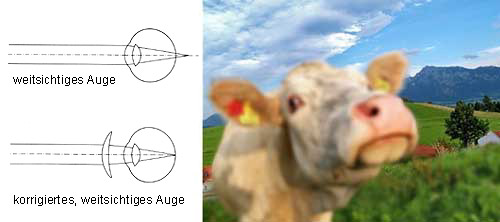 Die optische Korrektur (Brille oder Kontaktlinse) erfolgt mit einer Sammellinse (Konvexlinse) mit einem Korrekturwert in "Plus"-Dioptrien, mit der der Brennpunkt nach vorne auf das Netzhaut-Niveau verschoben wird.