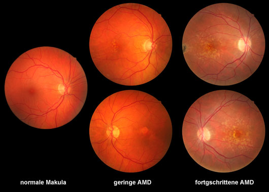 Kommt es zu Störungen im Stoffwechsel der Makula, bilden sich Ablagerungen unter der Netzhaut, und es entwickelt sich ein allmählicher Funktionsverlust des dort befindlichen Gewebes. Bei fortschreitender Krankheit wird die Sehfähigkeit durch das Absterben von Netzhautzellen beeinträchtigt. Die Folge ist, dass man in der Mitte des Gesichtsfeldes verschwommen, verzerrt oder einen dunklen Fleck sieht. Da nur die Netzhautmitte betroffen ist, bleibt das äußere Gesichtsfeld erhalten, so dass man zum Beispiel eine Uhr sehen, die Uhrzeit möglicherweise jedoch nicht erkennen kann.