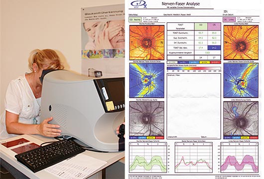 Bei der Nervenfaseranalyse mit dem Nerve Fiber Analyzer (GDx) werden mit polarisiertem Licht in höchster Auflösung die Nervenfasern um den Sehnervenkopf (parapapillar) vermessen und aus diesen Werten die Nervenfaserschichtdicke berechnet.